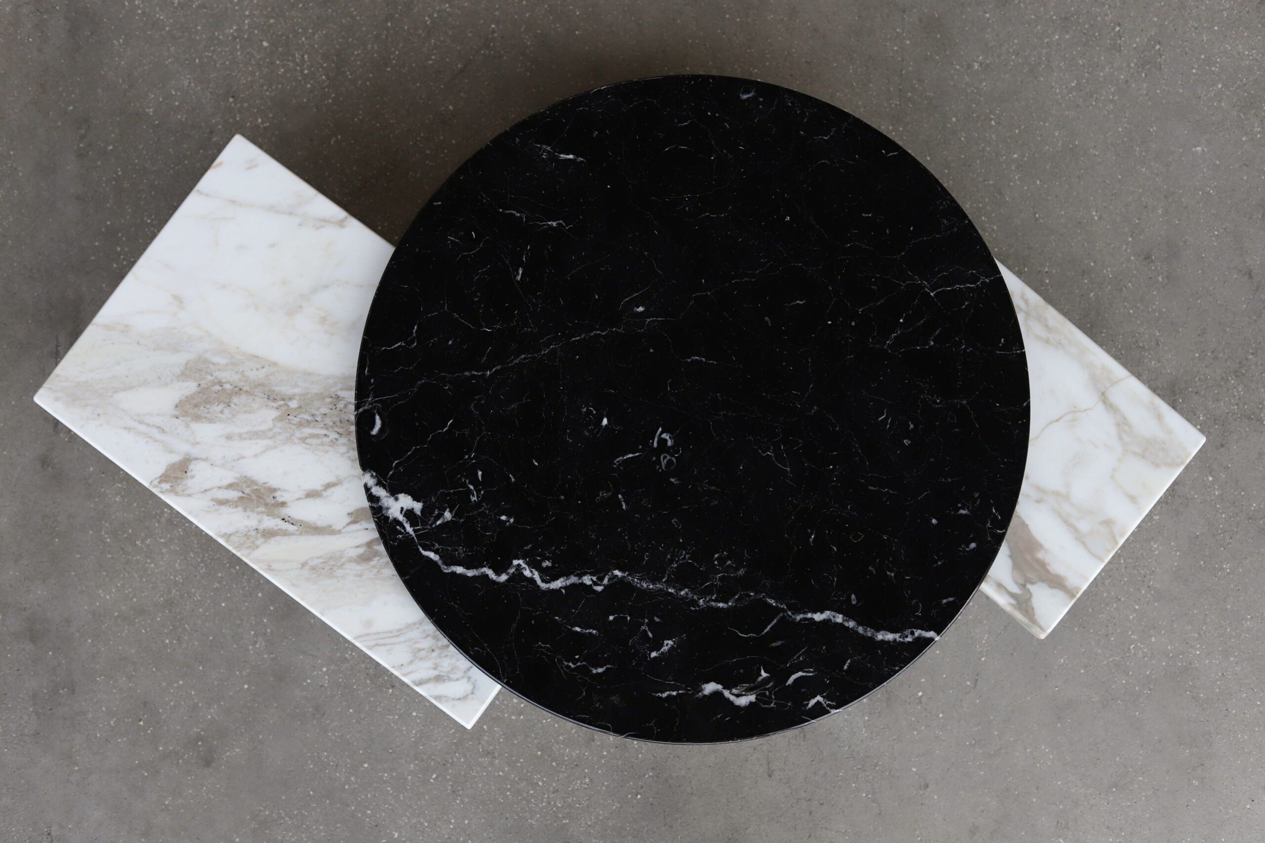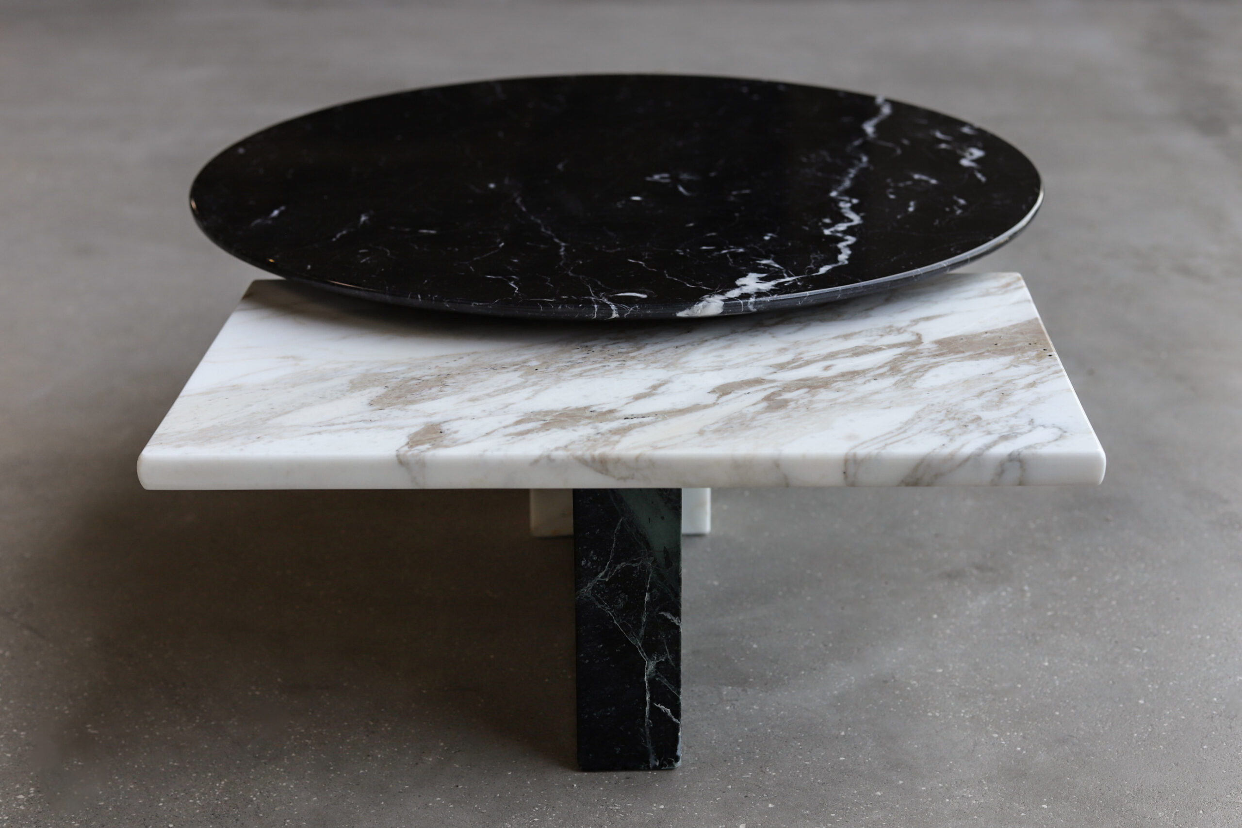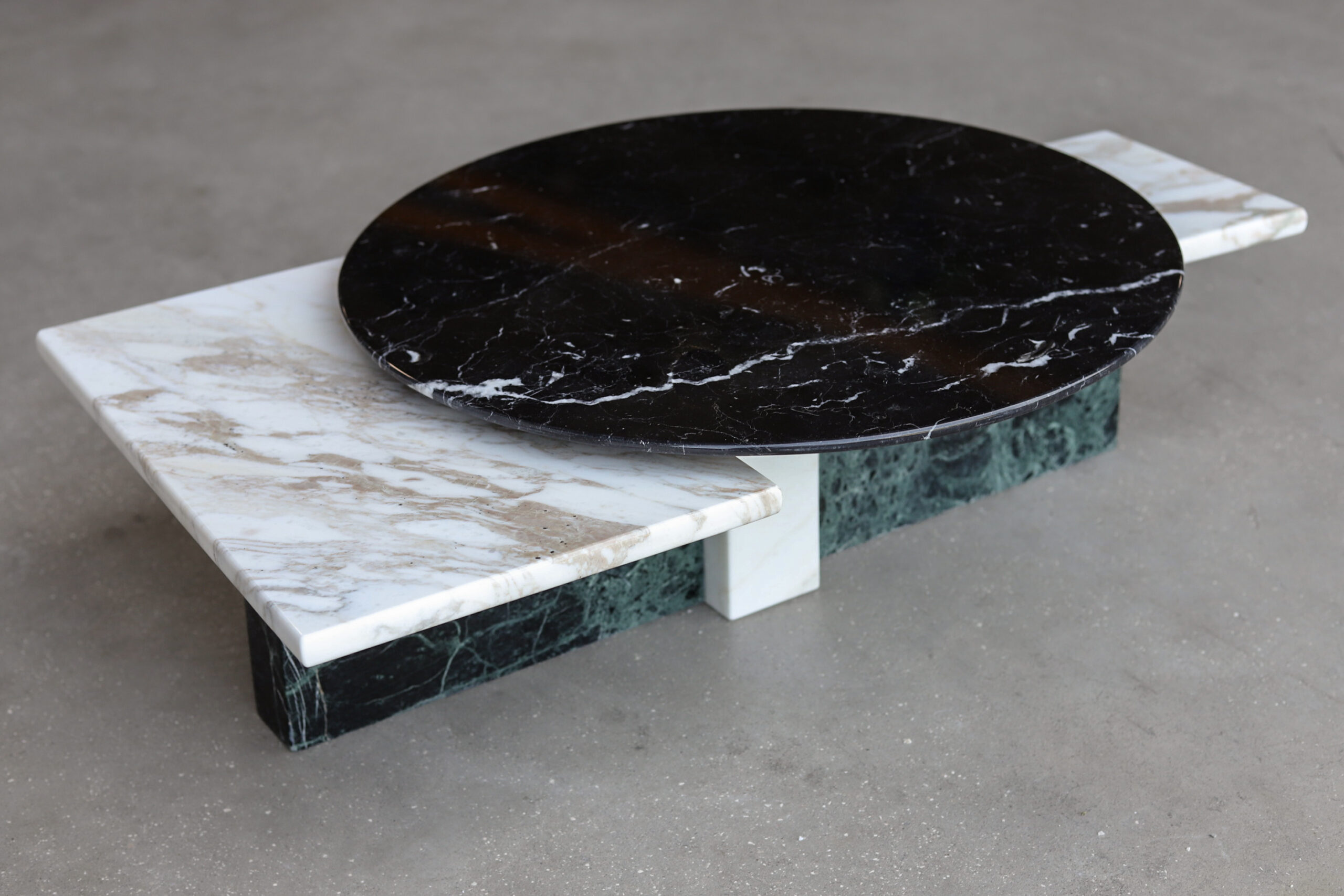 this particular low table is marked by a subtle beauty emphasized by the smoothness of its contemporary lines. tracing the pedestal base and the top’s irregular profile. The charm of the marble’s veining is further enhanced by the diverse rotatable tops that make the table vastly versatile.