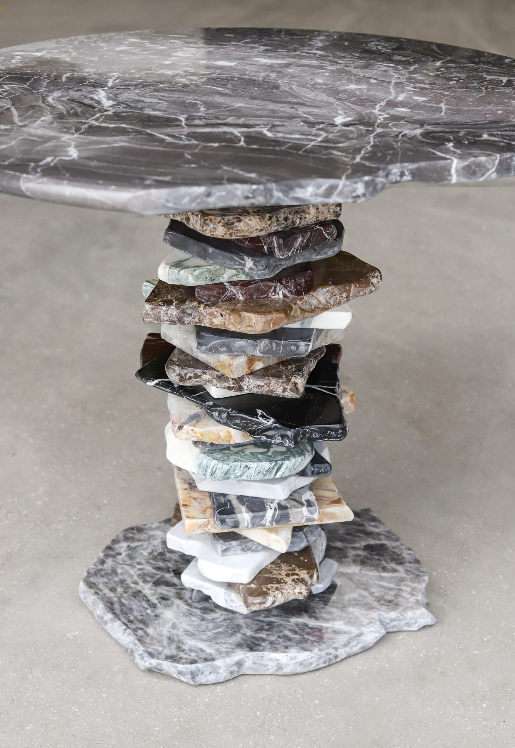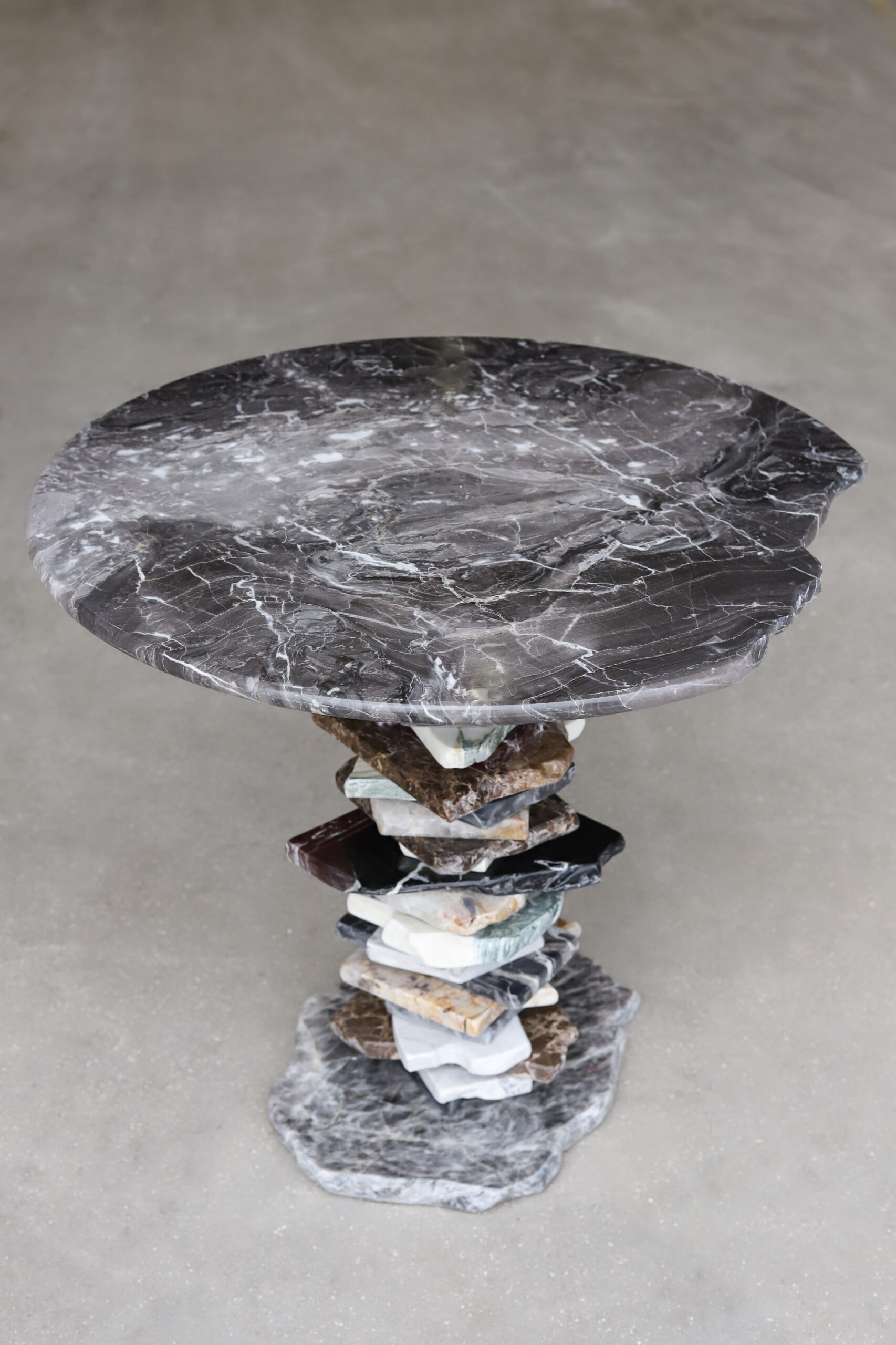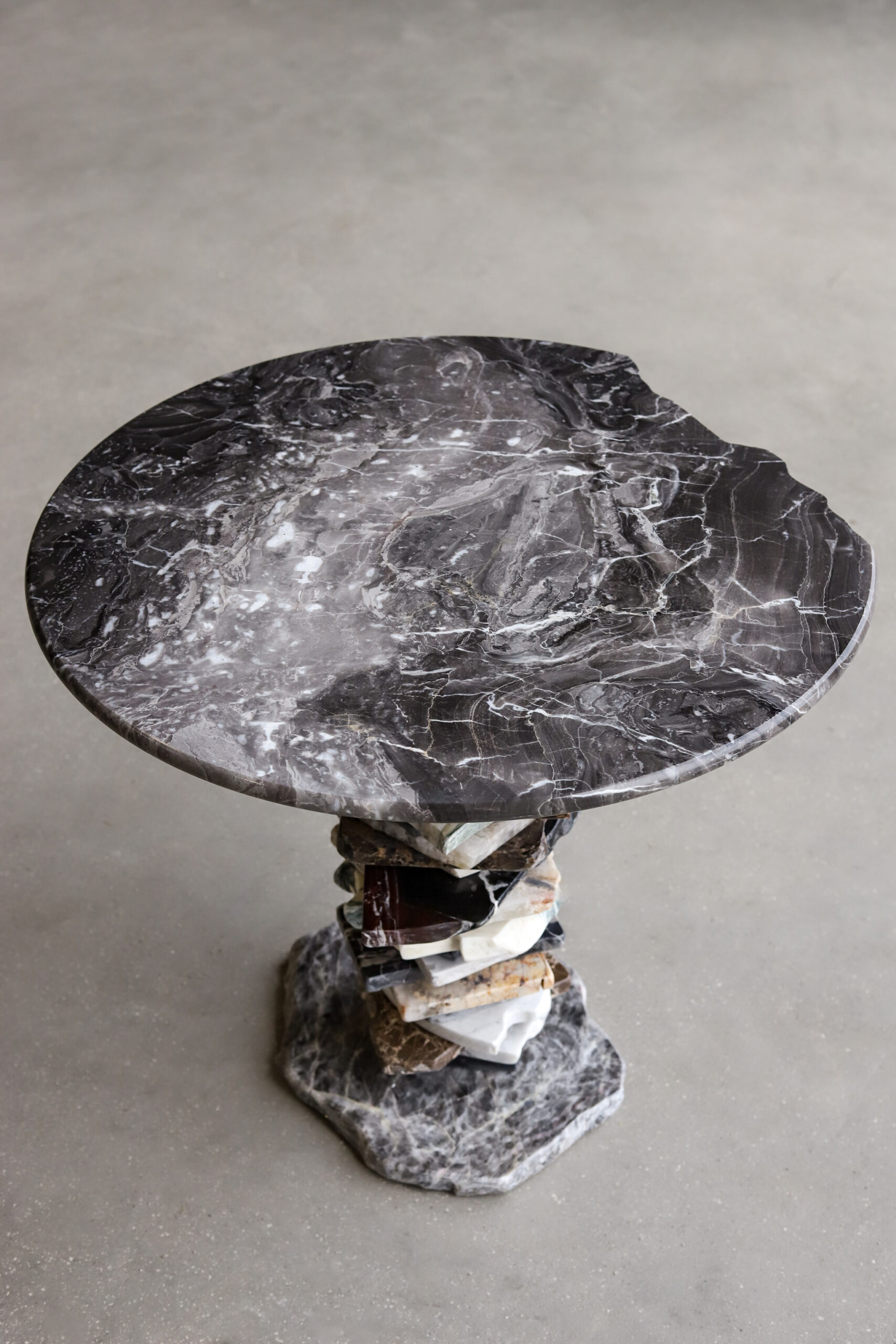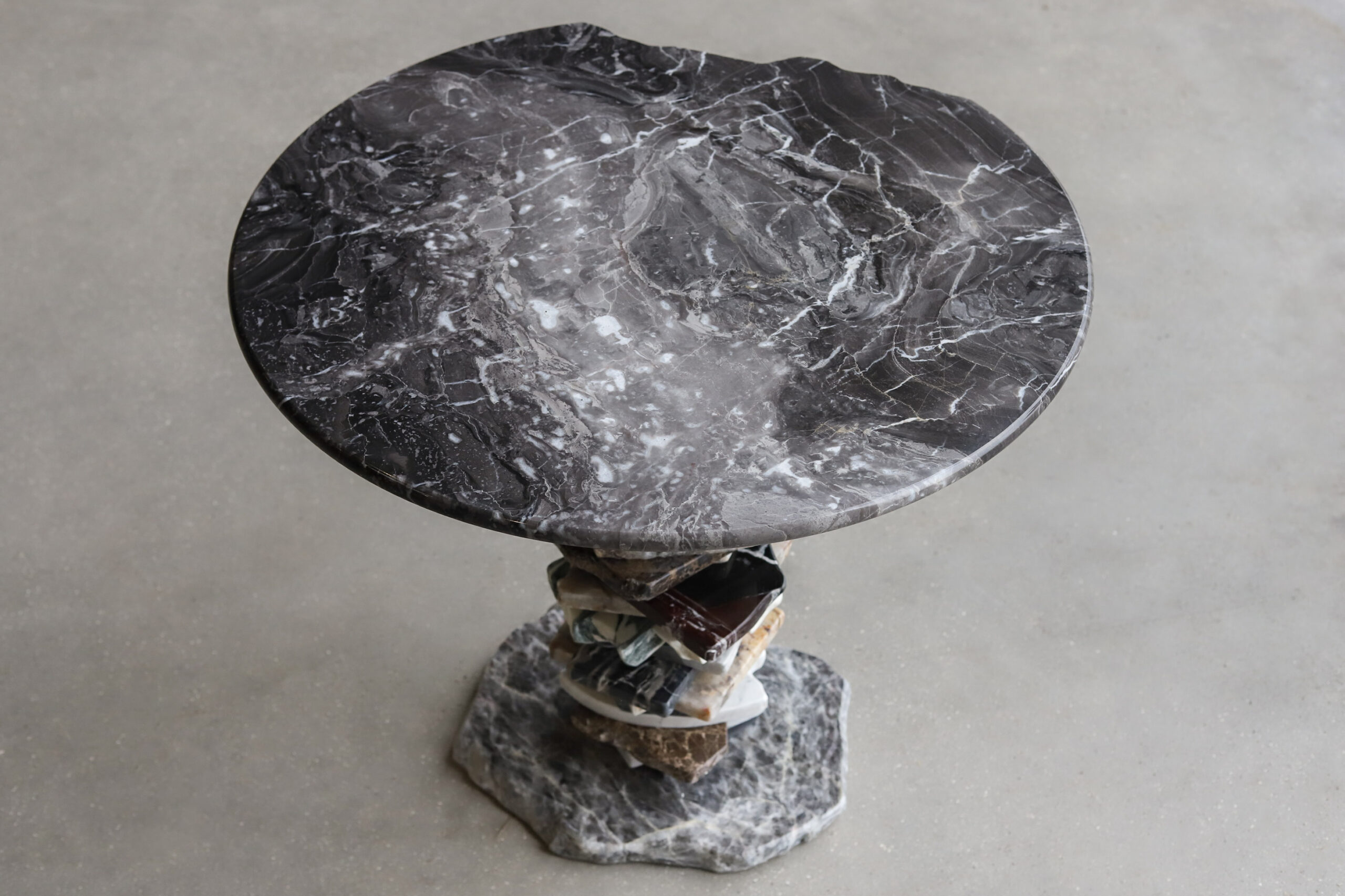 This small table perfectly reflects the concept of the collection, Stacking. Elicited from the concept of stone balancing, the central support is crafted stacking the broken pieces. The top parades an inperfect round Grigio Orobico marble, soothing and refining the design.