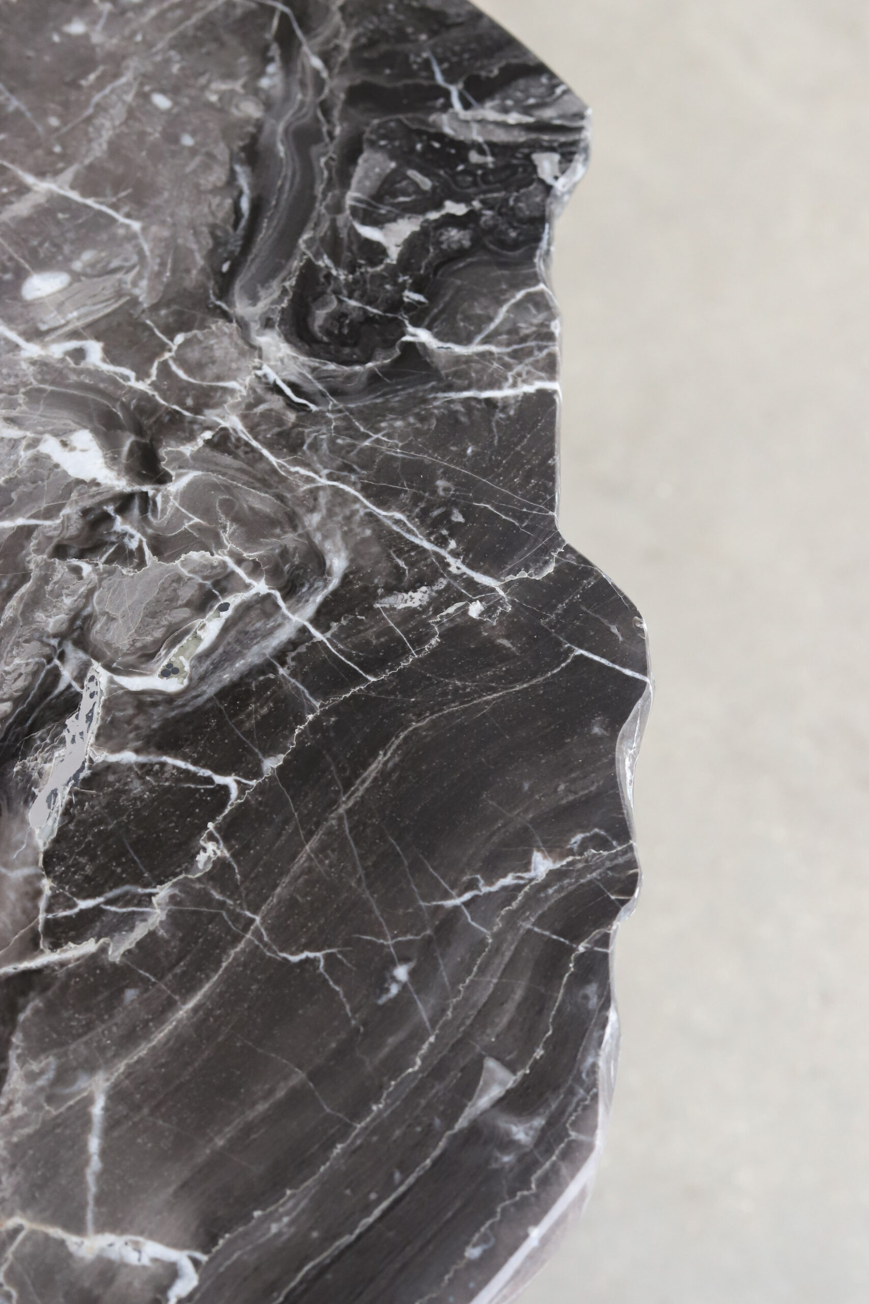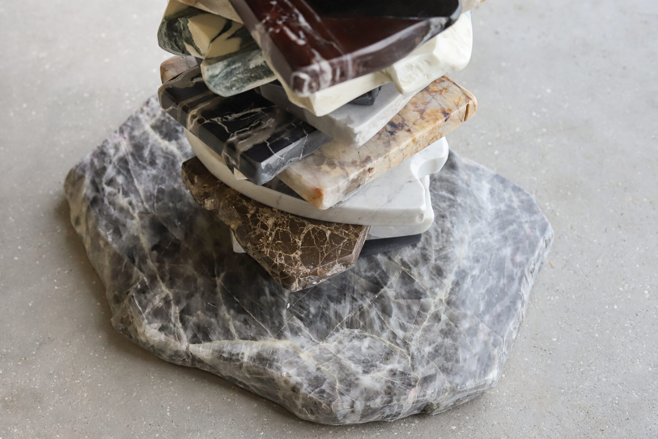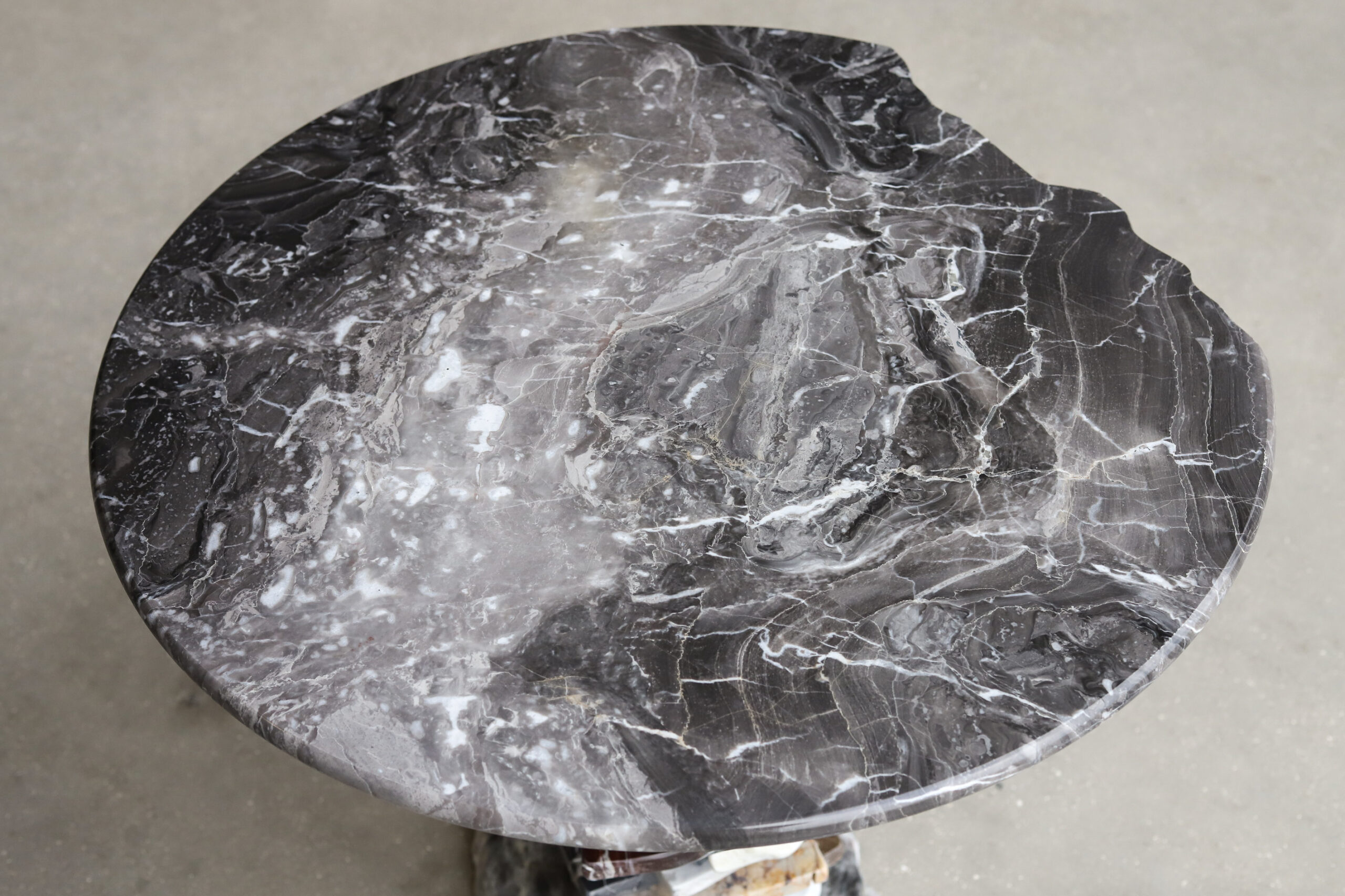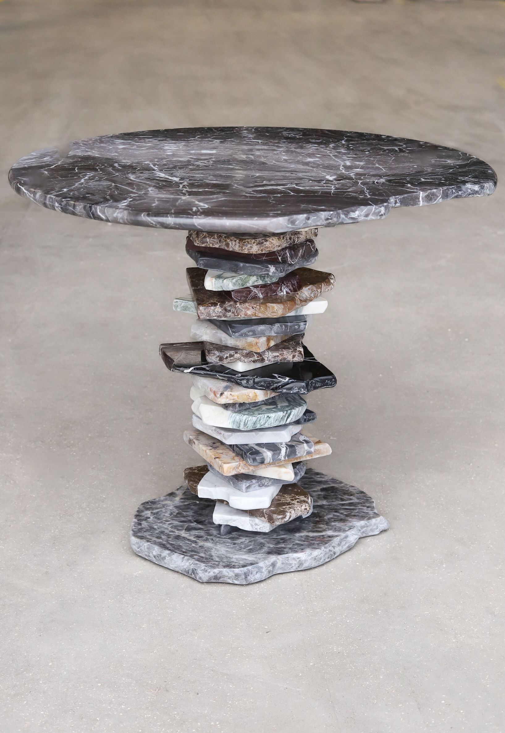 This small table perfectly reflects the concept of the collection, Stacking. Elicited from the concept of stone balancing, the central support is crafted stacking the broken pieces. The top parades an inperfect round Grigio Orobico marble, soothing and refining the design.