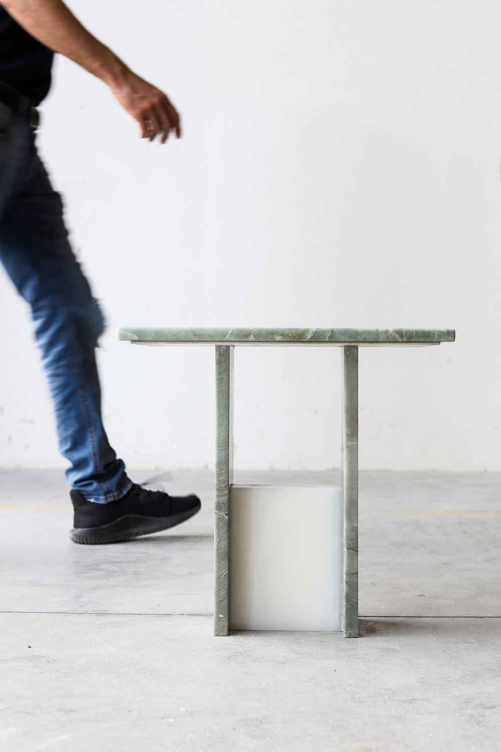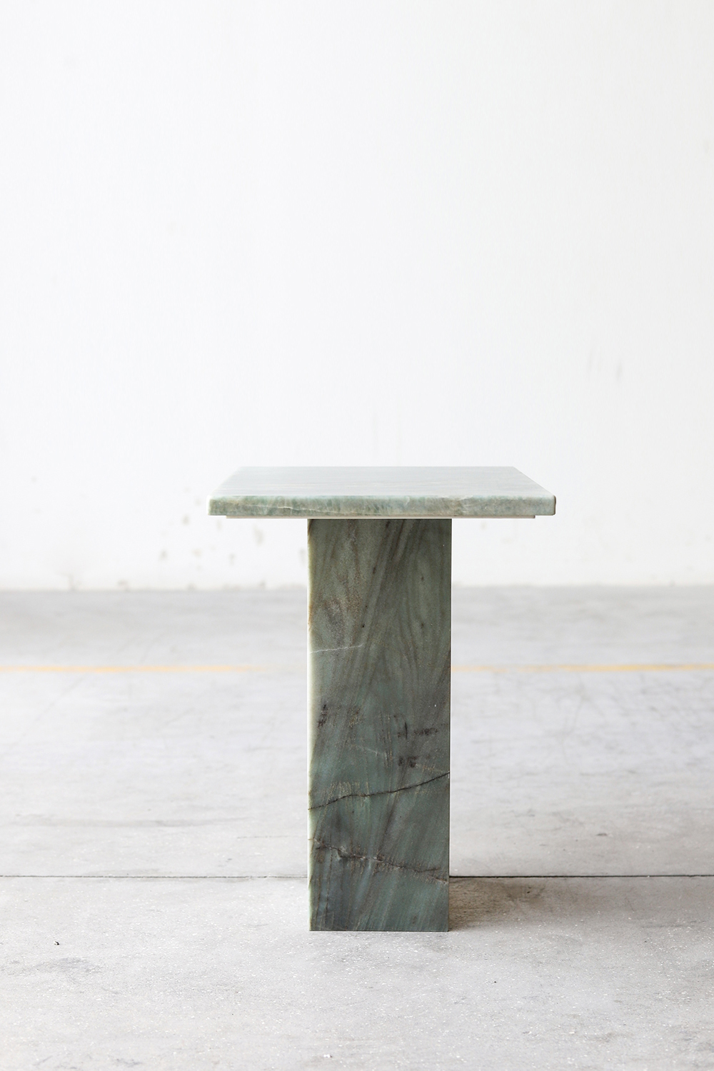 This side table is part of a set of two pieces. It combines sleek lines and sculptural marble stone elegantly juxtaposed to the likewise-fashioned top and side marble offcuts. A functional sculpture playing with geometry, balance, and nature to elevate the look of any contemporary living space.