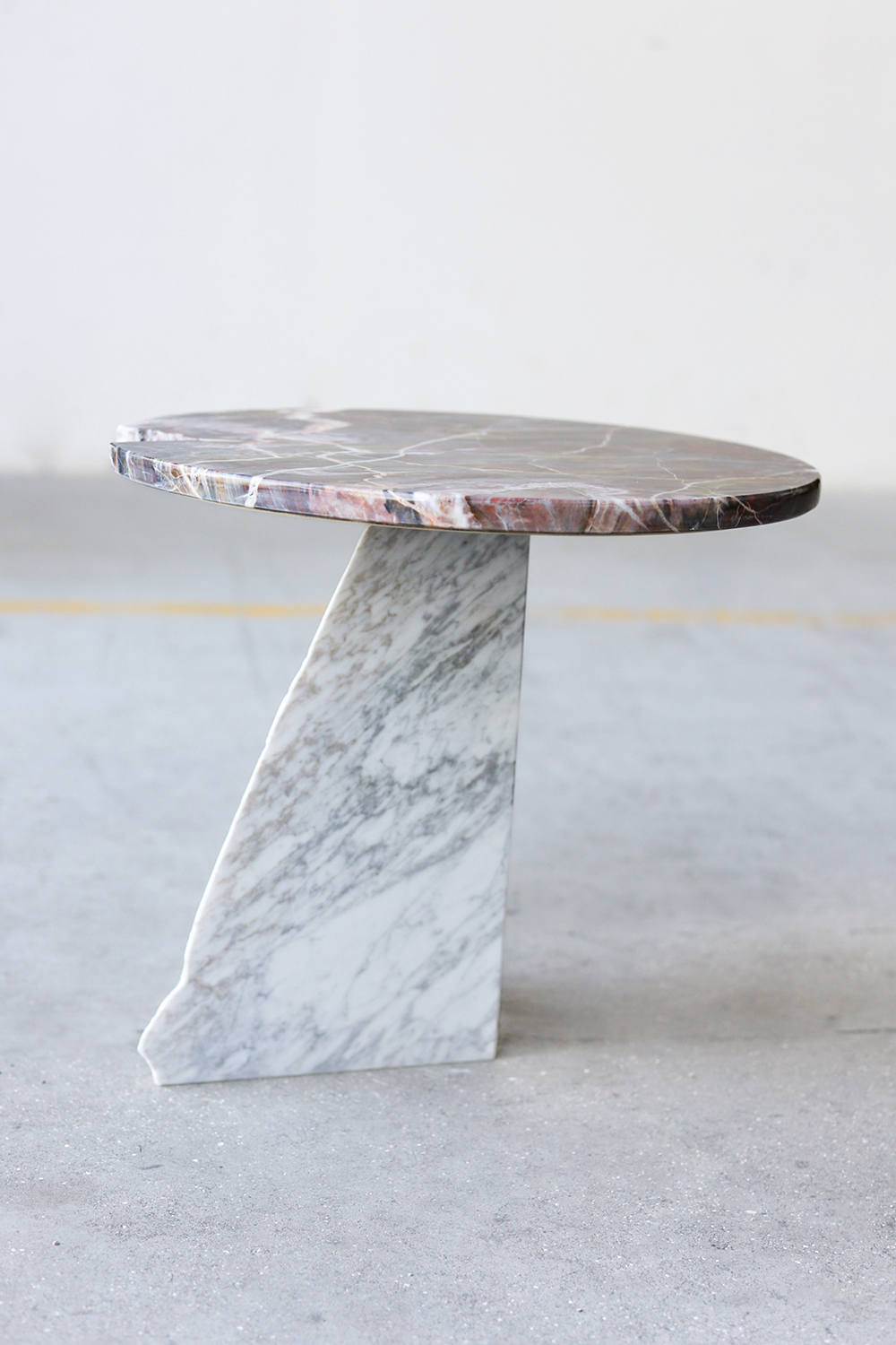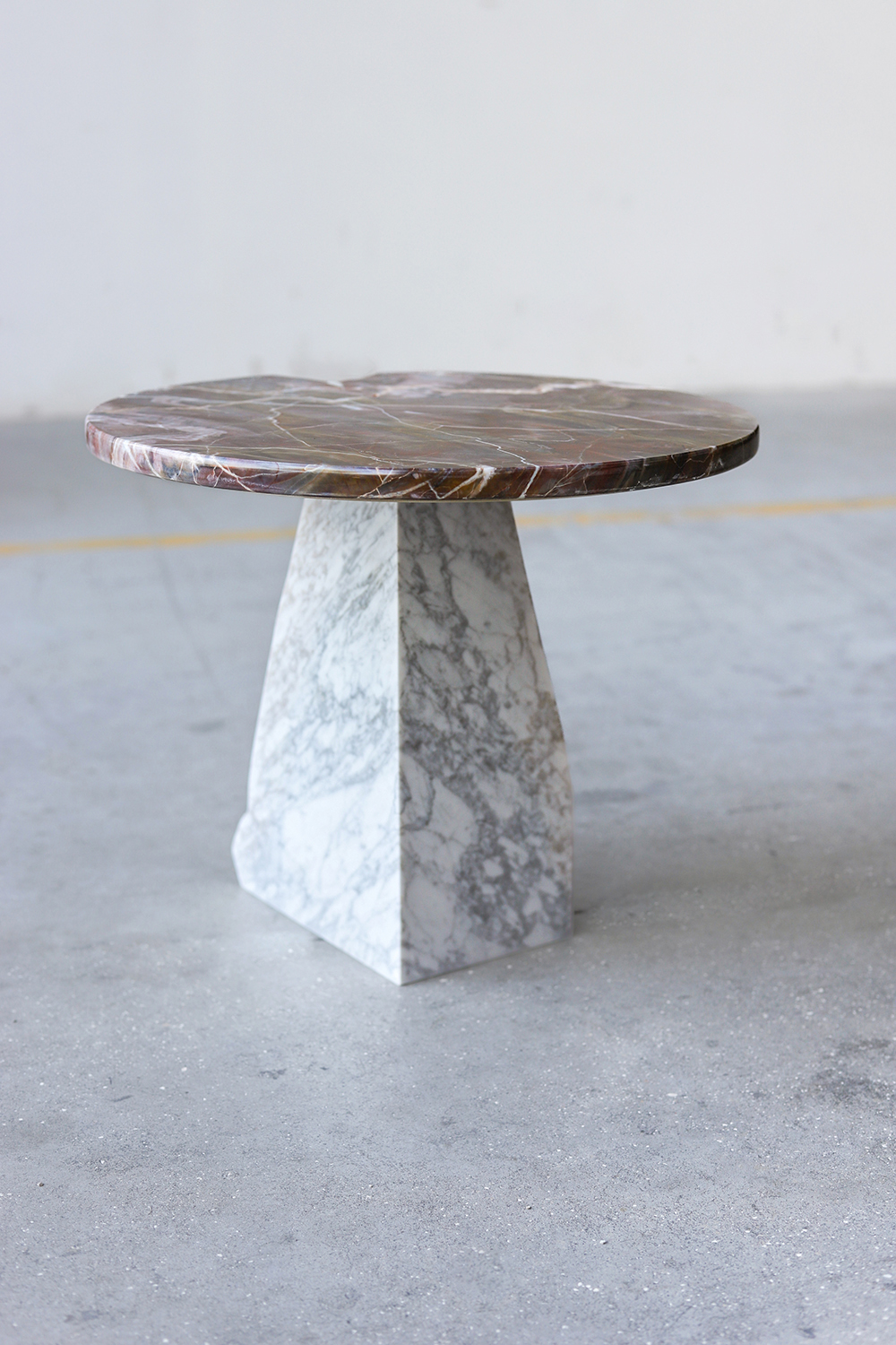 This elegant marble accent table with a perfectly regular top and solid base is developed merging Calacatta Oro and Confusion White marble, an exquisite marble combination that will add brilliance to any space that this table adorns.